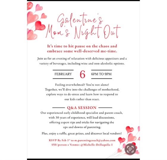 Join Michelle Dellaquila, an early childhood specialist, parenting coach, and other moms, for a night out and parenting advice. For more information about the event and RSVPing, please refer the flyer below: